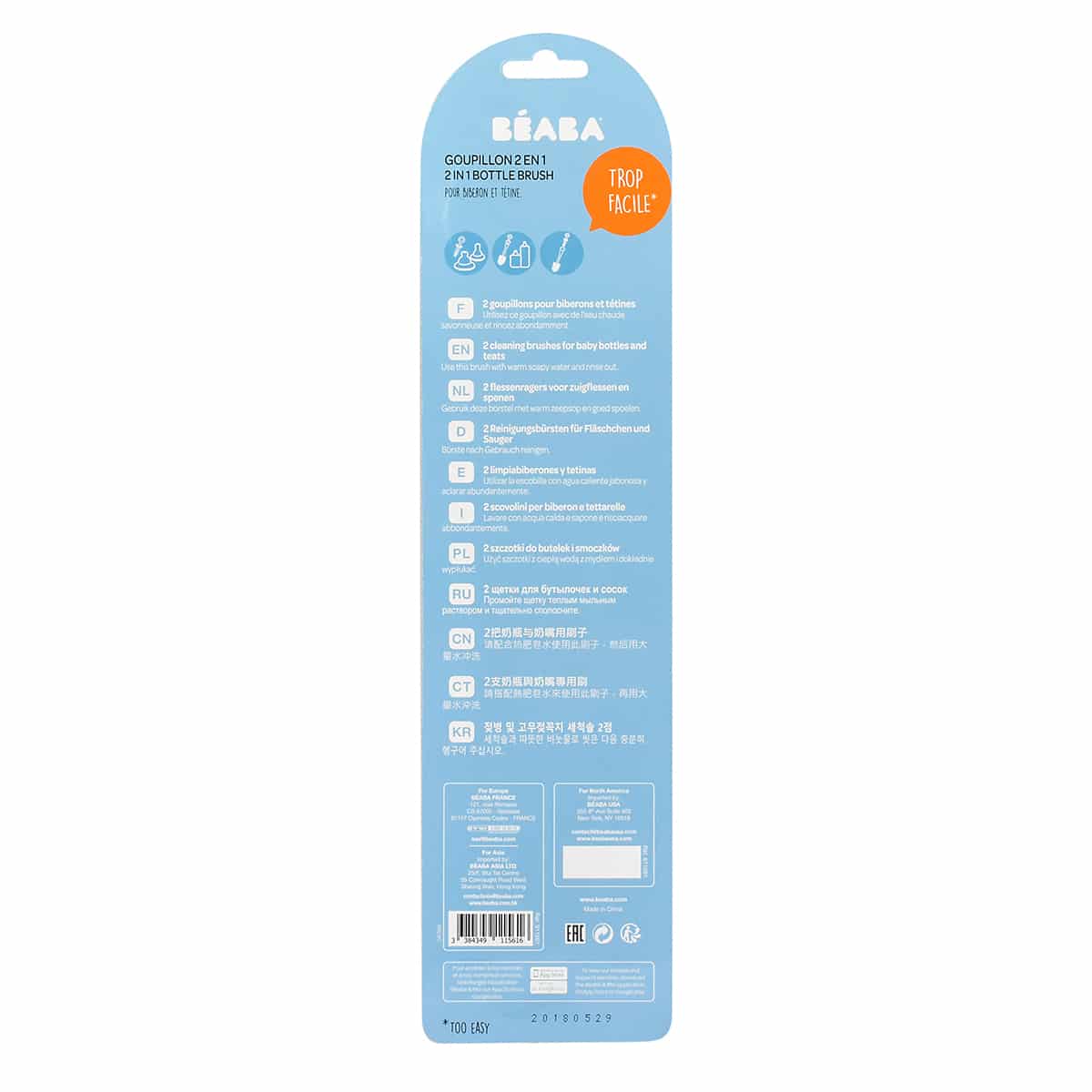 Son utilisation est très simple. Pour un nettoyage efficace, procédez par lavage à la main avec de l’eau chaude et du liquide vaisselle adapté. Utilisez la grande brosse pour l’intérieur du biberon et la mini-brosse pour nettoyer les tétines, les capuchons et les joints. Enfin, rincez abondamment à l’eau claire. Grâce à son étui perforé, le séchage est rapide et évite la stagnation de l’humidité.