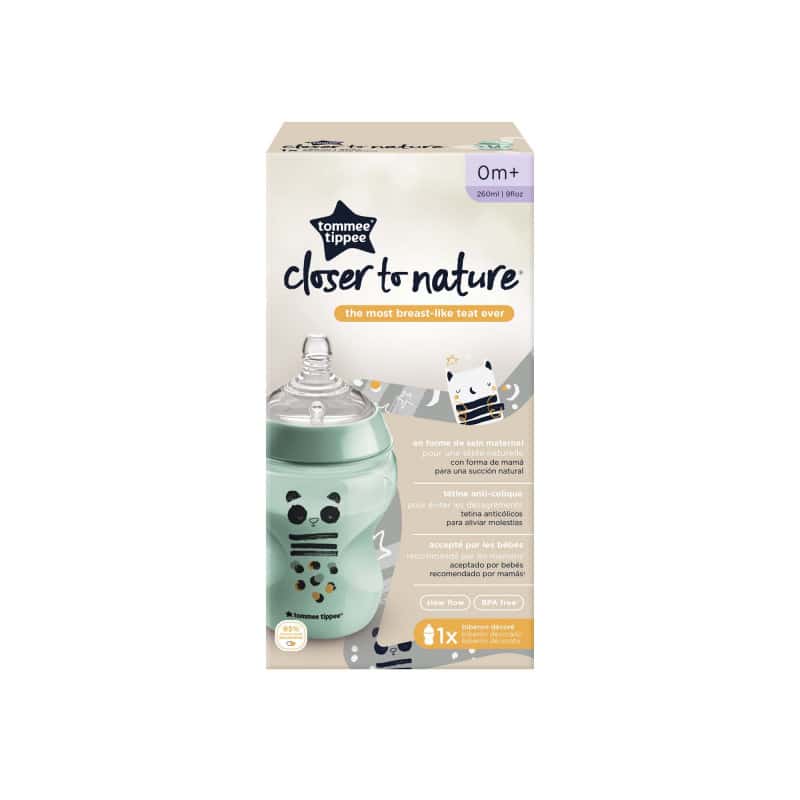 Découvrez Tommee Tippee Biberon Closer to Nature 260ml Panda [Nouveau modèle] sa contenance est parfaitement adaptée pour les nouveau-nés. Sa tétine easy-vent va empêcher l’accumulation de résidu de lait et limiter les risques d’absorption d’air pour éviter les coliques. Grâce à son silicone doux et flexible, la tétine imite parfaitement l’allaitement maternel. Sa forme ergonomique permet à votre petit bout de prendre son biberon facilement en main.