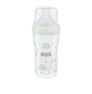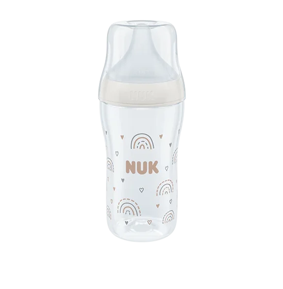 Découvrez le biberon NUK Perfect Match 260 ml : tétine silicone extra souple, anti‑colique, indicateur de température SafeTemp, sans BPA. Idéal dès 3 mois.