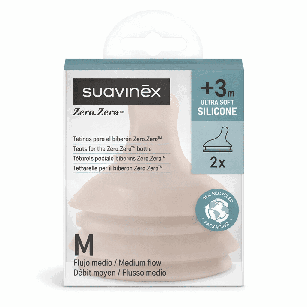 Les tétines Suavinex Zéro Zéro débit moyen sont recommandées dès 3 mois.