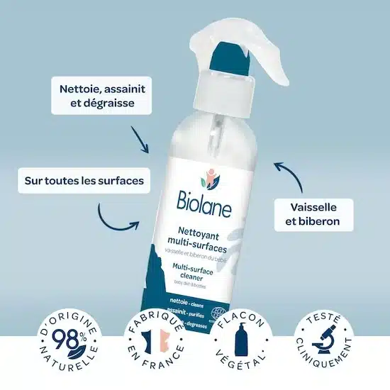 Biolane propose aussi des accessoires pratiques. Ainsi, le sac essentiels bébé regroupe les soins indispensables avec un sac à langer offert. La trousse de toilette est idéale pour les déplacements. De plus, le dentifrice bio 1ères dents 50 ml accompagne l'hygiène bucco-dentaire dès les premières dents. Enfin, la lessive bébé 750 ml et le nettoyant multi-surfaces vaisselle et biberon 250 ml complètent l'univers ménage bébé.