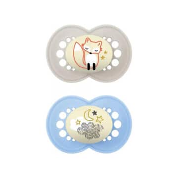 Tout d’abord, le lot de 2 sucettes nuit MAM Original 6 mois+ a été spécialement conçu pour accompagner bébé pendant son sommeil.