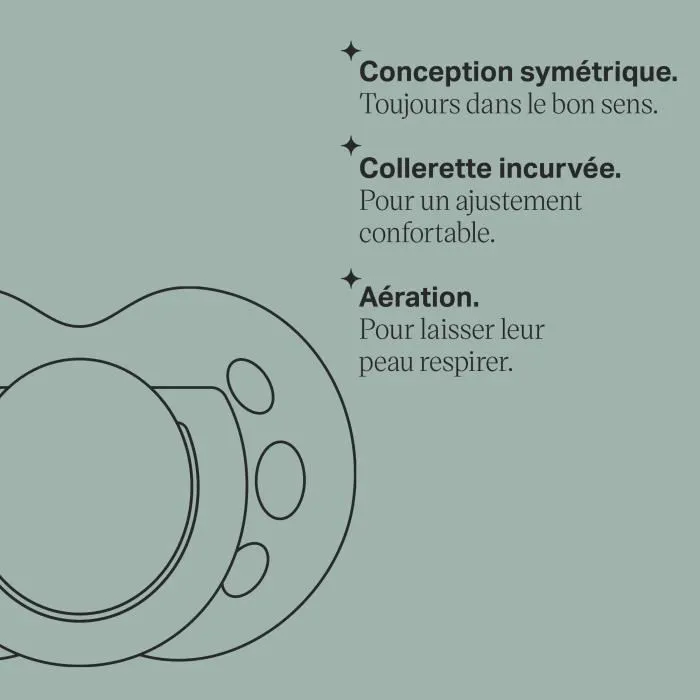 • Tétine en silicone symétrique (pour qu’elle soit toujours dans le bon sens)