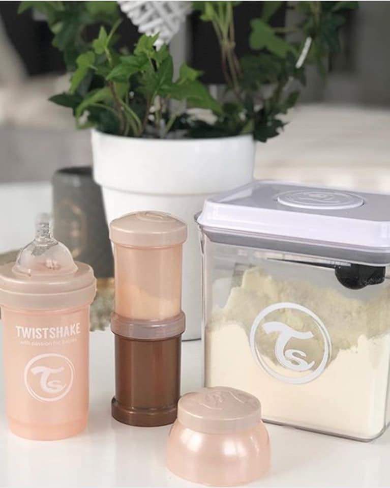 Twistshake Récipient pour lait en poudre Blanc : Stockage astucieux de lait en poudre ou de bouillie ! Il n’a jamais été aussi facile de servir des aliments à votre bébé d’une seule main. Ce récipient pour lait en poudre innovant a un design hygiénique avec un couvercle hermétique qui peut être ouvert d’un seul clic. Le récipient pour lait en poudre comprend un doseur ainsi qu’un bord ingénieux afin que vous puissiez retirer l’excès de poudre lors du portionnement. Soyez ingénieux et achetez le récipient pour lait en poudre en plusieurs couleurs pour marquer différents contenus. Choisissez entre blanc, noir, bleu et rose. Notre astuce juste pour vous : le récipient pour lait en poudre fonctionne aussi très bien pour votre indispensable café.