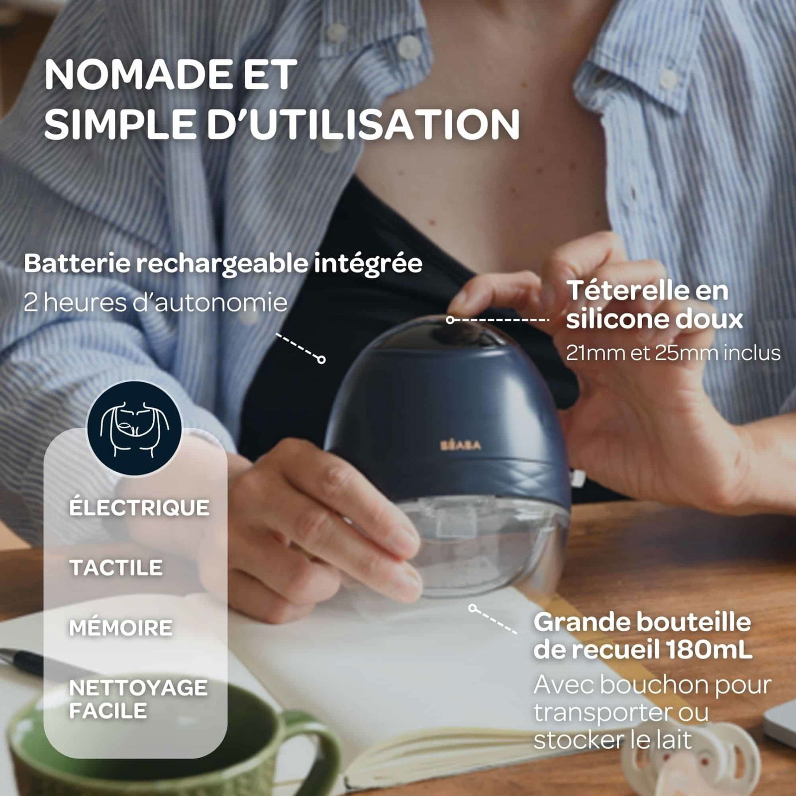 Quelles sont les spécificités du Beaba Tire-lait électrique mains libres nomade Night blue?