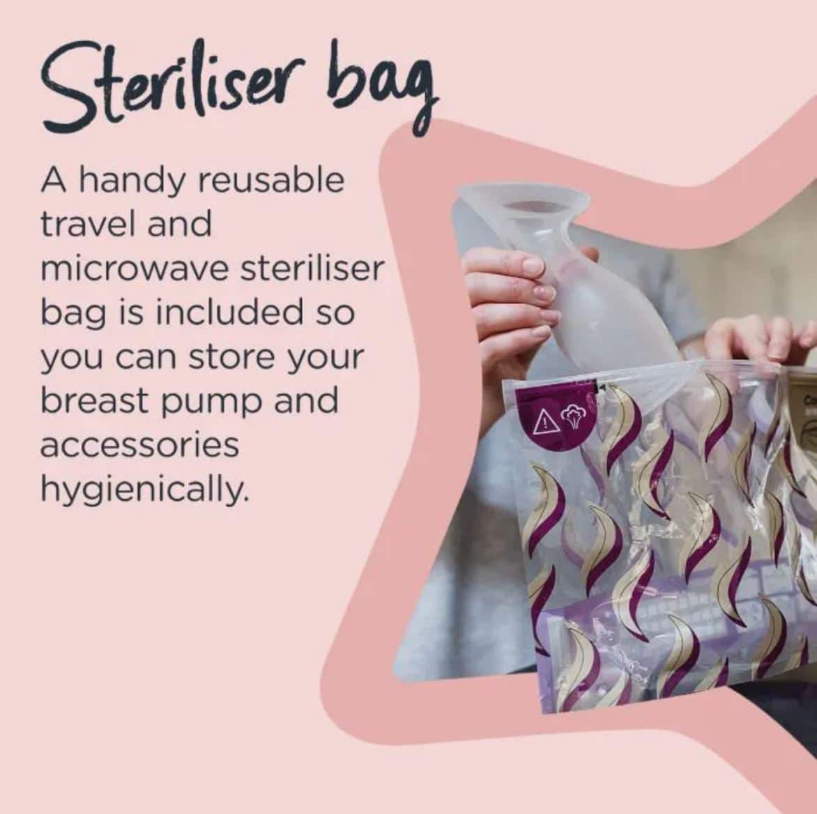 Vous pouvez utiliser une pochette de stérilisation de voyage adaptée au micro-ondes. C’est une façon simple de conserver et stériliser votre tire-lait et ses accessoires, tout en éliminant 99 % des germes. Chaque pochette peut être réutilisée jusqu’à 30 fois, dans une optique de protection de l’environnement.