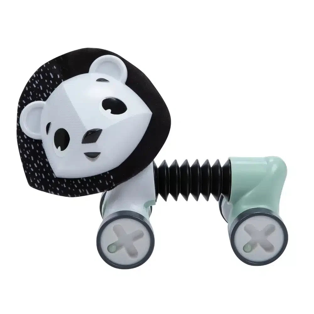 Ce jouet à roulettes est un compagnon polyvalent pour le développement de bébé. En effet, il favorise spécifiquement l’éveil visuel grâce à son design en noir, blanc et vert cendré. Ces contrastes forts captent l’attention des tout-petits, même avant 3 mois.