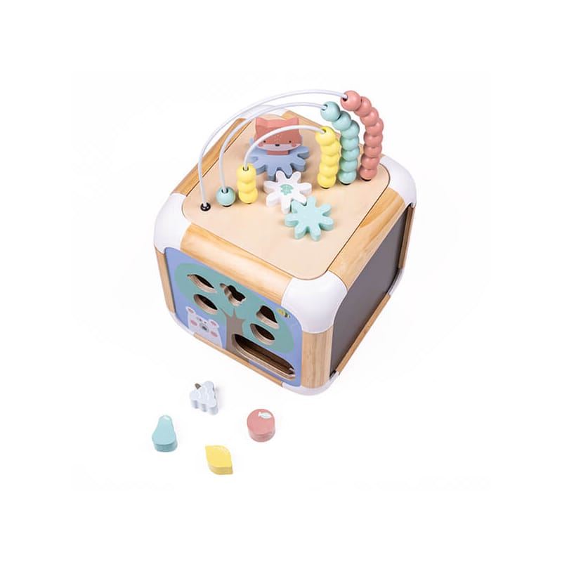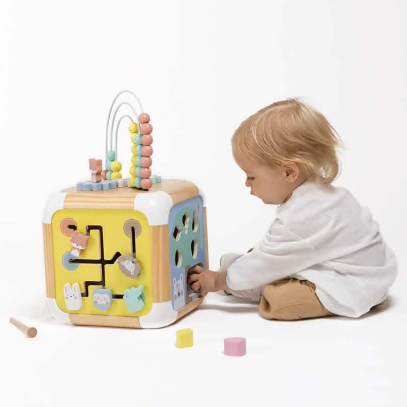 Le cube offre plus de 5 activités éducatives : engrenages, labyrinthe, tri de formes, portes, horloge, etc.