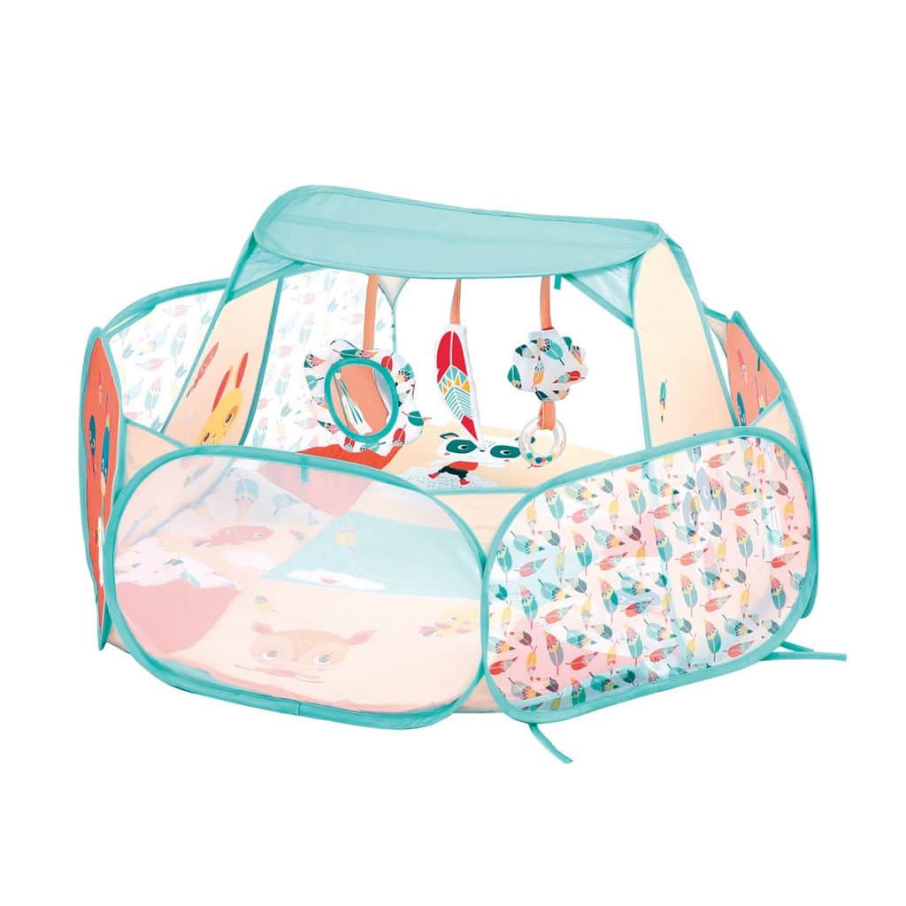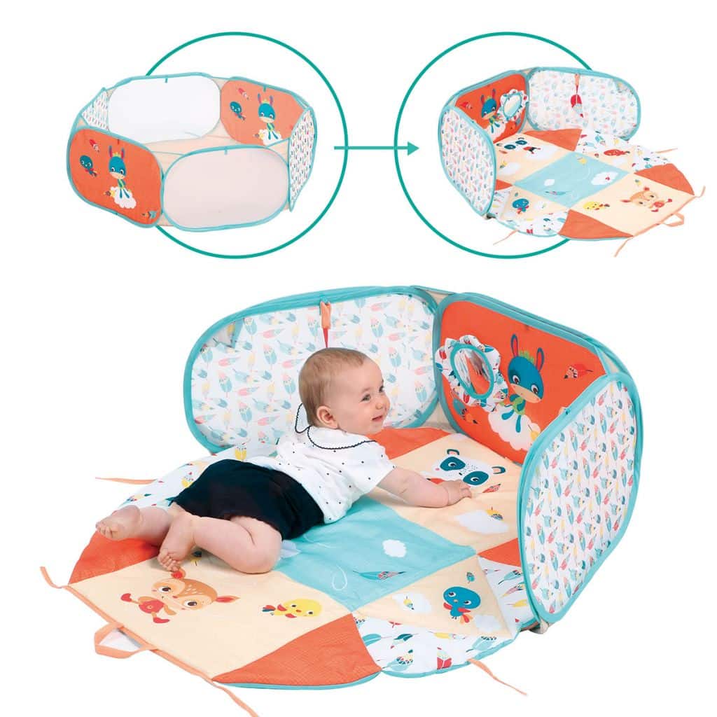 Au bout de quelques mois, bébé apprend à s’asseoir et à marcher à quatre pattes. Dépliez alors le tableau d’éveil qui devient une aire de jeu pop-up ! Installez le tapis au fond du petit parc souple pour plus de confort et de sécurité. Fixez enfin les activités amovibles sur les boucles d’accroches prévues à cet effet. Dans cet espace, bébé pourra jouer avec ses jouets préférés !