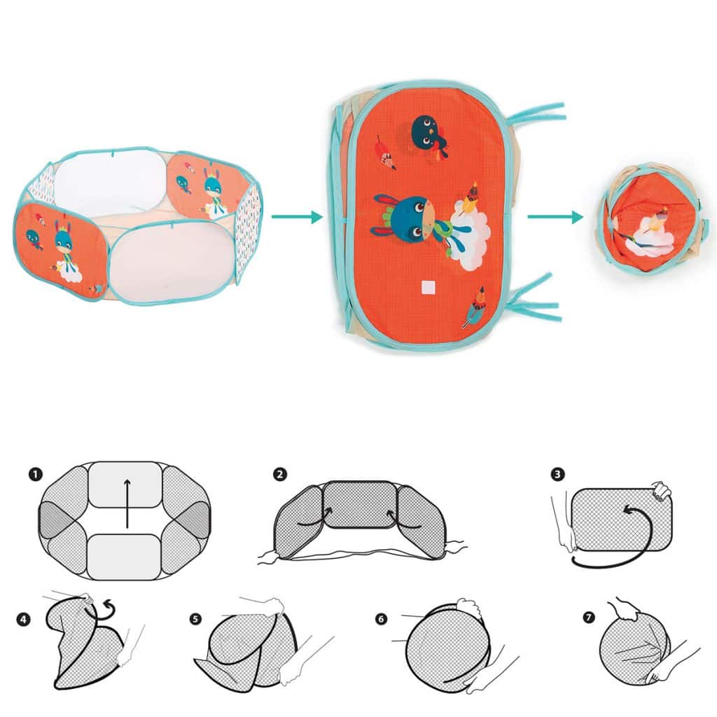 La structure pop-up et légère de l’aire de jeu est très facile à installer ou à replier sur elle-même. Placez la ensuite au centre du tapis avec l’arche puis rabattez les bords, que vous pourrez accrocher avec les liens. Une petite poignée vous permet de transporter l’ensemble très facilement pour profiter des vacances ou des week-ends en famille avec bébé !