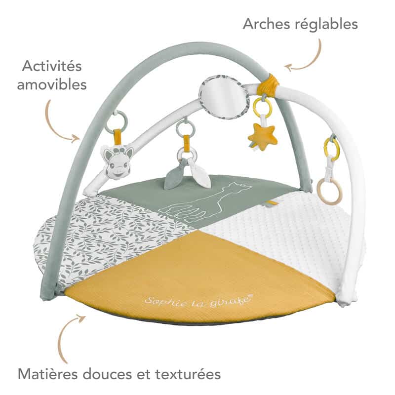 – Les 2 arches réglables permettent de modifier la position des activités pour inciter bébé à tourner la tête, se muscler et développer sa motricité