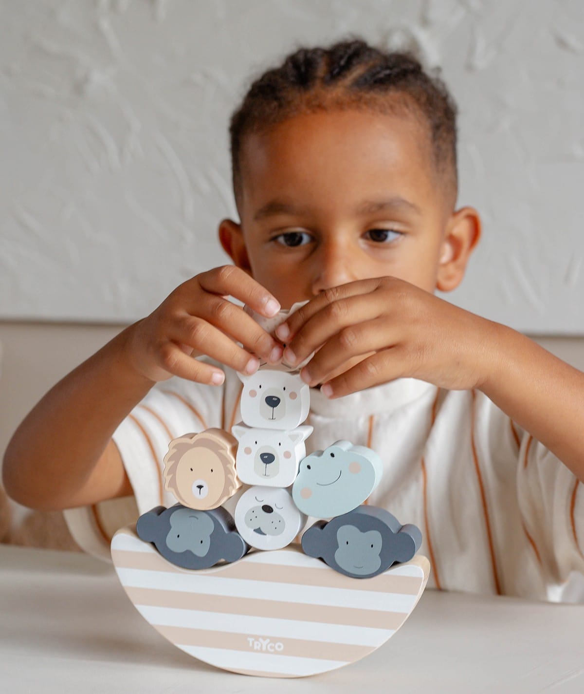 Jeu d’équilibre éducatif en bois naturel Tryco Jungle. Développe la motricité fine et la concentration des enfants de 3 à 6 ans. Jouet Montessori certifié EN71, sans plastique.