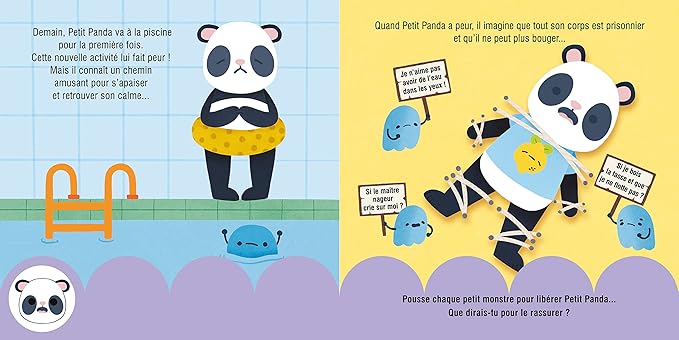 Dans ce livre, Petit Panda a peur. Il ne sait pas trop pourquoi, mais il ne se sent pas bien. Heureusement, page après page, l’enfant l’aide à se calmer grâce à des gestes simples et ludiques : souffler doucement, poser une main sur son cœur, faire une pause… Ces rituels agissent comme un véritable chemin vers l’apaisement.