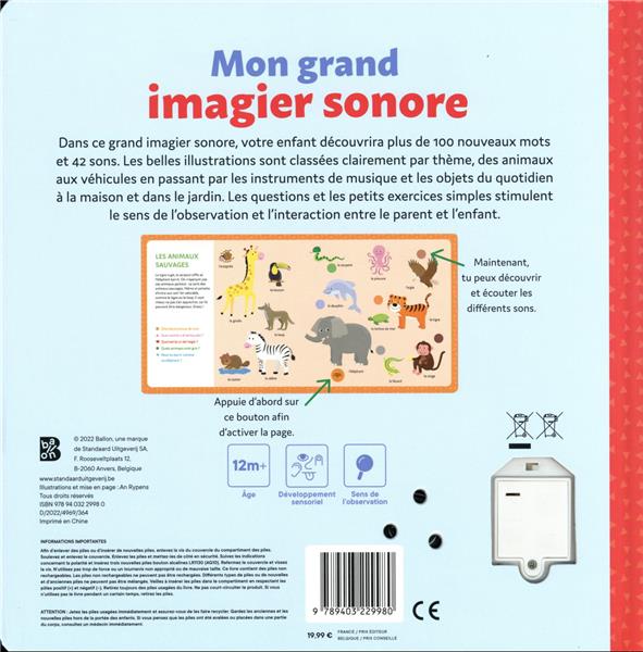 Mon grand imagier sonore : Dans ce grand imagier sonore, votre enfant va découvrir plus de 100 nouveaux mots et 42 sons différents, tout en explorant de manière interactive les objets et animaux de son quotidien. Les belles illustrations sont classées par thème, pour offrir une expérience d’apprentissage claire et ludique :