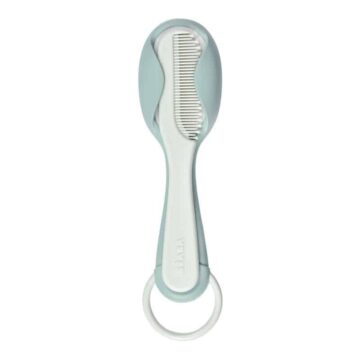 Peigne + brosse Béaba bleu/vert : poils en nylon ultra‑doux, peigne antinœuds, manche ergonomique, anneau suspendable. Dès la naissance, prise en main facile.