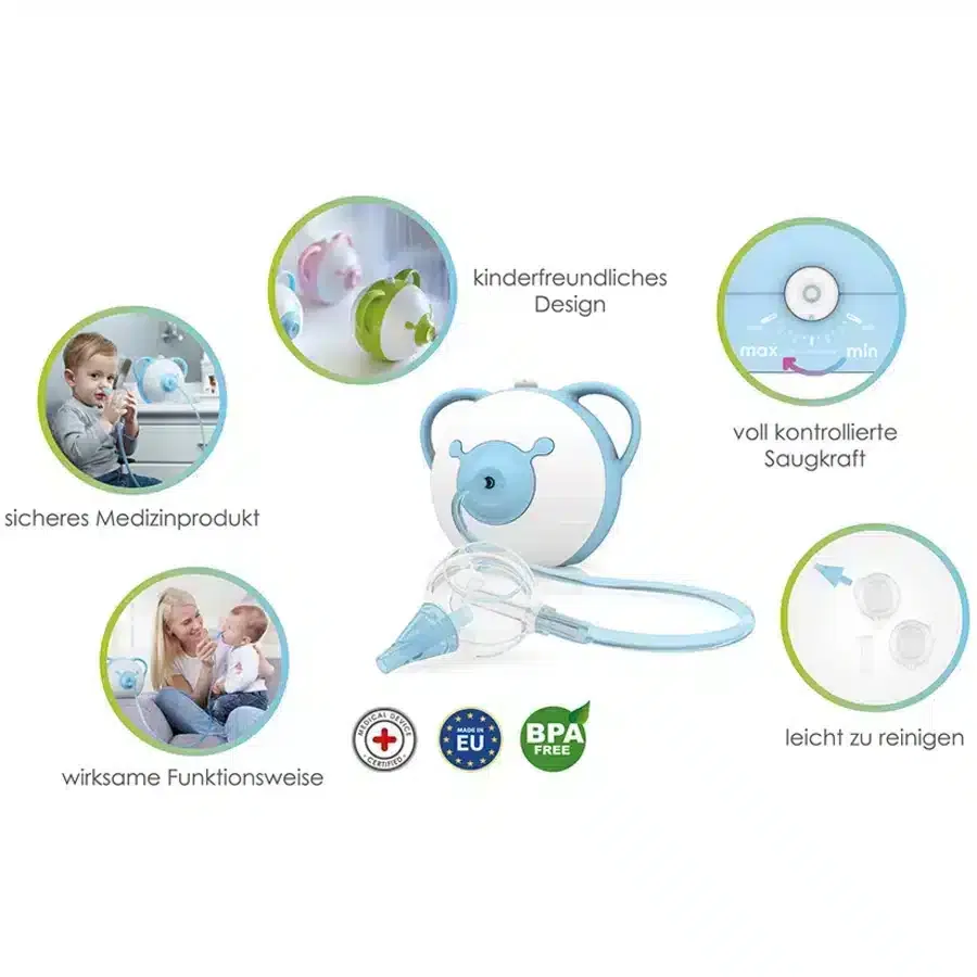 Nosiboo Mouche bébé électrique Pro bleu un nouveau modèle de mouche-bébés. Un nez bouché de bébé est souvent un gros souci pour toute la famille, surtout la nuit. Bébé ne parvient pas à se moucher tout seul, c’est pourquoi ses parents doivent tout faire pour qu’il puisse respirer de nouveau facilement. Grâce au mouche-bébé nosiboo bébé respirera de nouveau facilement rapidement. Le mouche-bébé nosiboo permet à bébé comme à ses parents de reprendre leurs tâches quotidiennes.