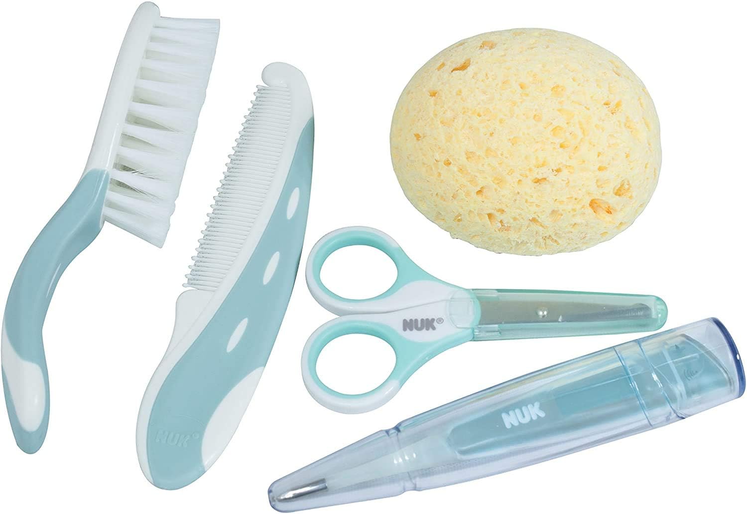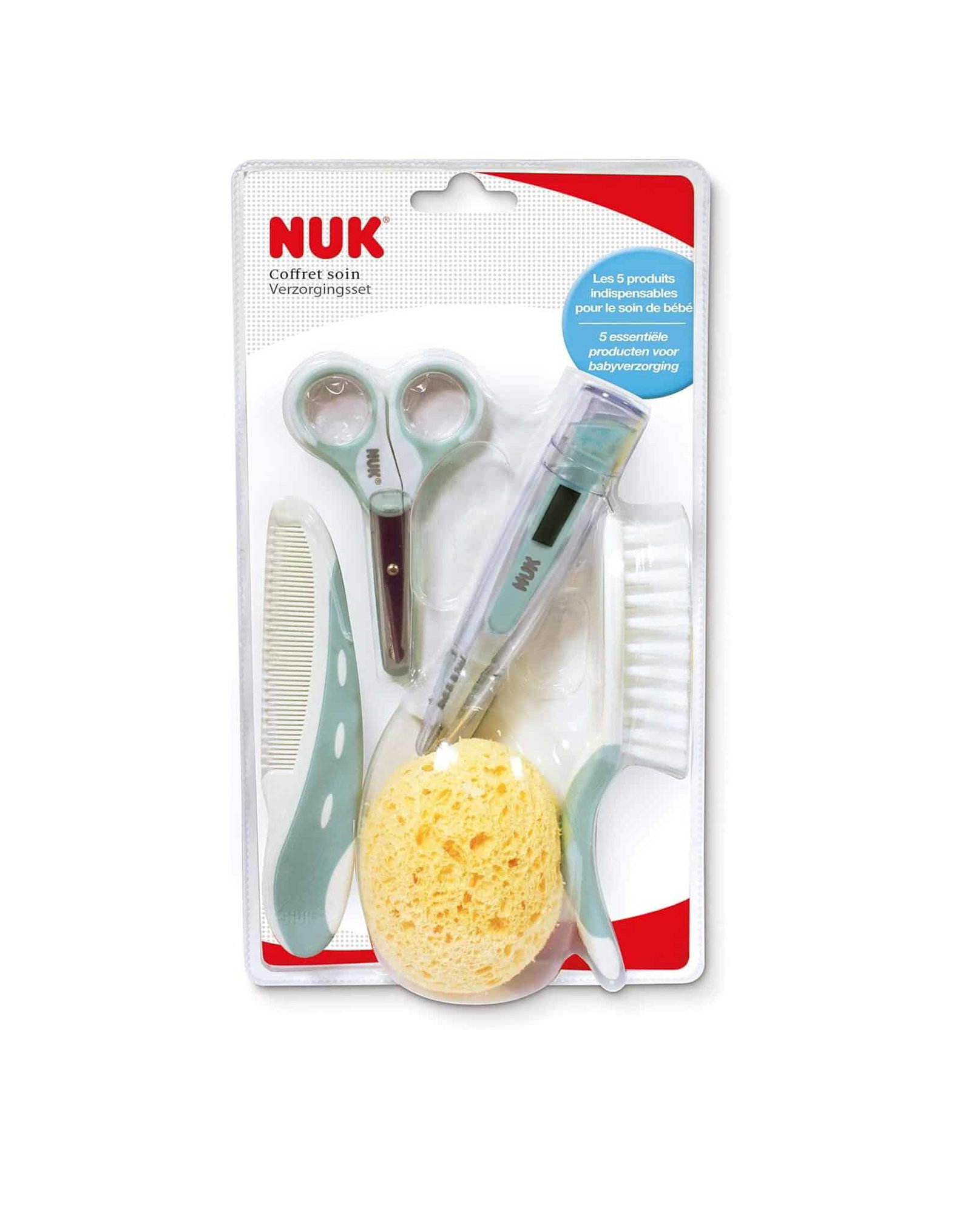 Coffret de soin Nuk 5 pièces, l’essentiel pour la toilette et le bien-être de votre nouveau-né. Inclut brosse, peigne, ciseaux à bout rond, thermomètre électronique et éponge hypoallergénique. Sans BPA.