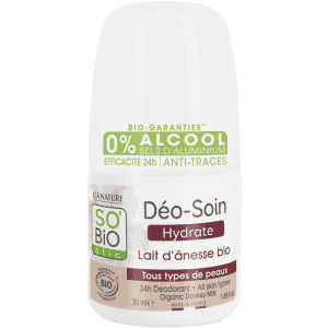 Le déodorant bille So Bio Déo‑Soin Douceur, enrichi en lait d’ânesse bio, est spécialement conçu pour les peaux sensibles. Il offre une efficacité 24 heures sans bloquer la transpiration naturelle, tout en neutralisant les odeurs grâce à sa formule douce et apaisante .