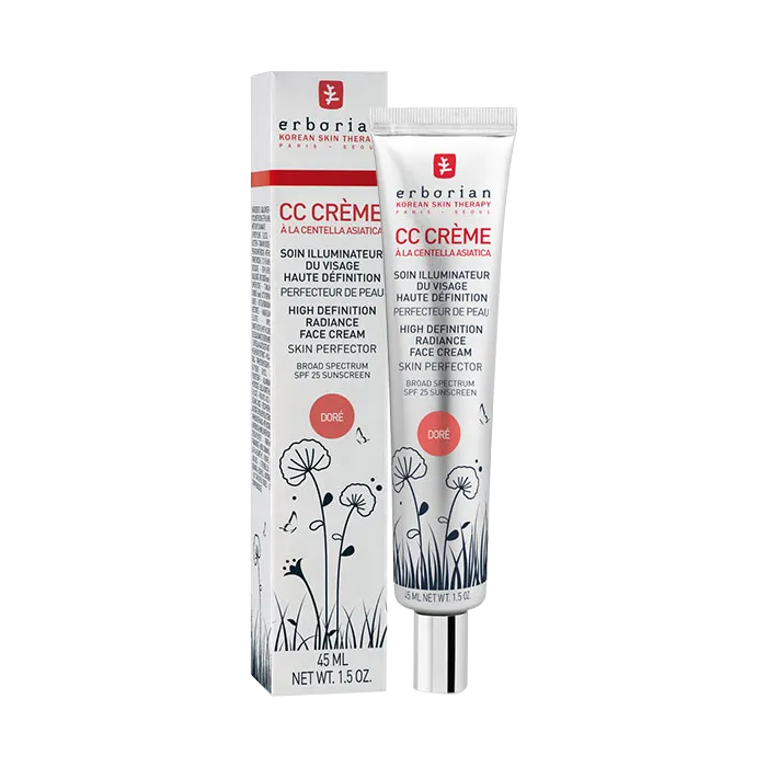 CC Crème Erborian Doré 45ml : correction, éclat et hydratation pour peaux mates. Enrichie en Centella Asiatica avec protection solaire SPF25.