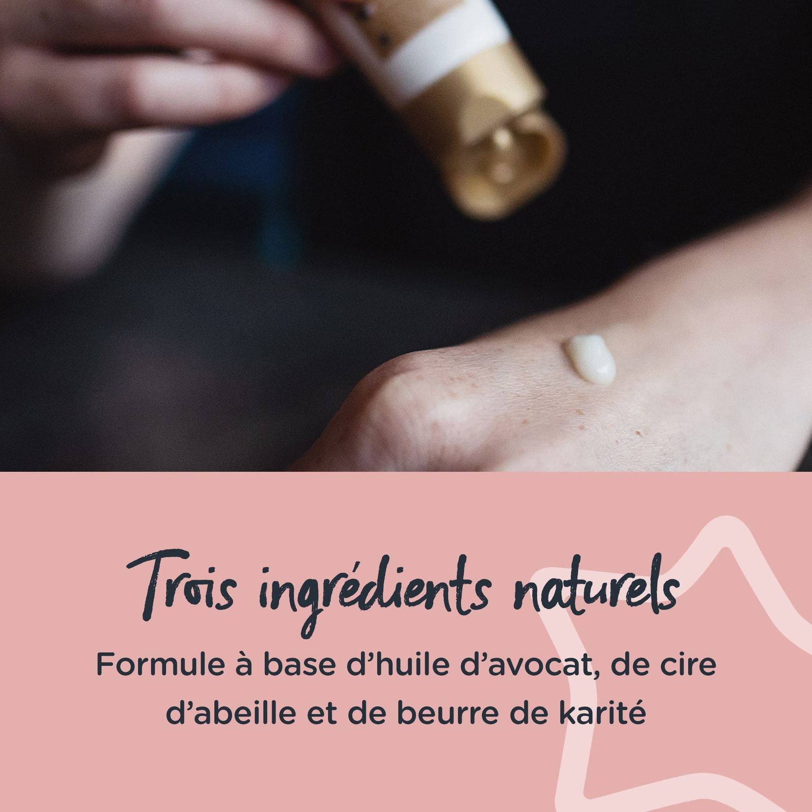 - Trois ingrédients naturels uniquement : formule à base d’huile d’avocat, de cire d’abeille et de beurre de karité, cette formule ne présente aucun risque ni pour les nourrissons ni pour les mamans.