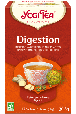 Yogi Tea Digestion Cette infusion s’inspire des secrets des masalas, les mélanges d’épices de la cuisine indienne, qui rendent la nourriture si délicieuse et facile à digérer. L’Ayurvéda aussi apprécie le fenouil, la réglisse et la menthe poivrée pour ces propriétés. Des herbes et des épices comme la cardamome et le gingembre aident à parfaire le goût de cette infusion. C’est ainsi que YOGI TEA® Digestion nous invite à savourer nos repas de manière consciente.