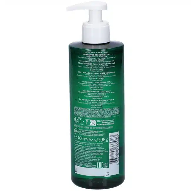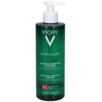 Le Vichy Normaderm Gel Nettoyant Purifiant Intense 400ml nettoie en profondeur les pores, élimine les impuretés et régule l’excès de sébum sans agresser la peau. Parfait pour les peaux à tendance acnéique ou grasses.