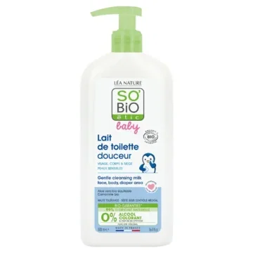 Absolument, le So Bio Baby Lait de Toilette Douceur 500ml est conçu pour nettoyer le visage sans irriter.