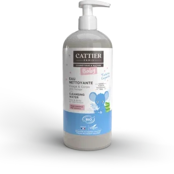 Nettoyez en douceur la peau sensible de bébé avec l’Eau Nettoyante Micellaire Bio de Cattier. Formule naturelle sans rinçage, enrichie en calendula et aloe vera bio, idéale pour le visage et le corps. Hypoallergénique et sans parfum. 🌼👶