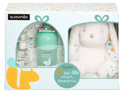 Un coffret naissance tendre et raffiné signé Suavinex, avec une peluche douce et deux Baby Cologne Vert au parfum délicat, spécialement conçues pour la peau sensible de bébé.