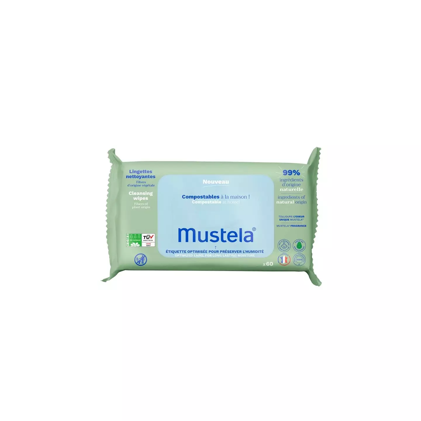 Mustela Lingettes nettoyantes à l’Avocat BIO 60 unités faites à partir de fibres d’origine végétale (0% plastique) nettoient efficacement visage, mains et siège, dès la naissance*. Composées à 97% d’ingrédients d’origine naturelle. Résistantes et au toucher doux, elles sont parfaites pour une utilisation nomade. Avec l’odeur unique de bébé Mustela.