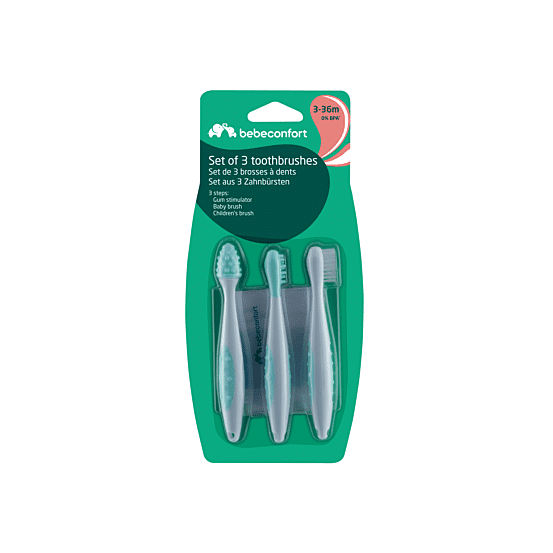 Set de 3 brosses à dents Bébé Confort avec étui protecteur. Idéal pour les premières dents, avec des poils ultra-doux et un manche ergonomique. Une solution complète et économique pour l’hygiène bucco-dentaire de votre enfant.