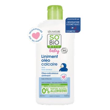 So Bio Liniment oléo-calcaire 250ml baby nettoie et élimine en douceur les impuretés des fesses de bébé. Dès l’application, sa peau est nourrieapaisée et protégée.