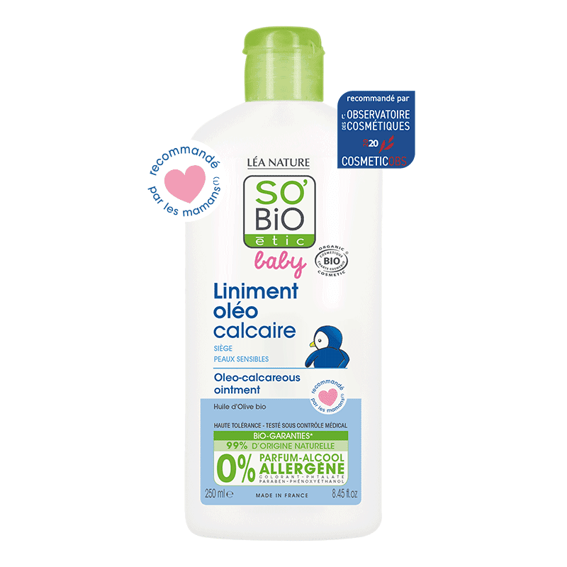 So Bio Liniment oléo-calcaire 250ml baby nettoie et élimine en douceur les impuretés des fesses de bébé. Dès l’application, sa peau est nourrie, apaisée et protégée.
