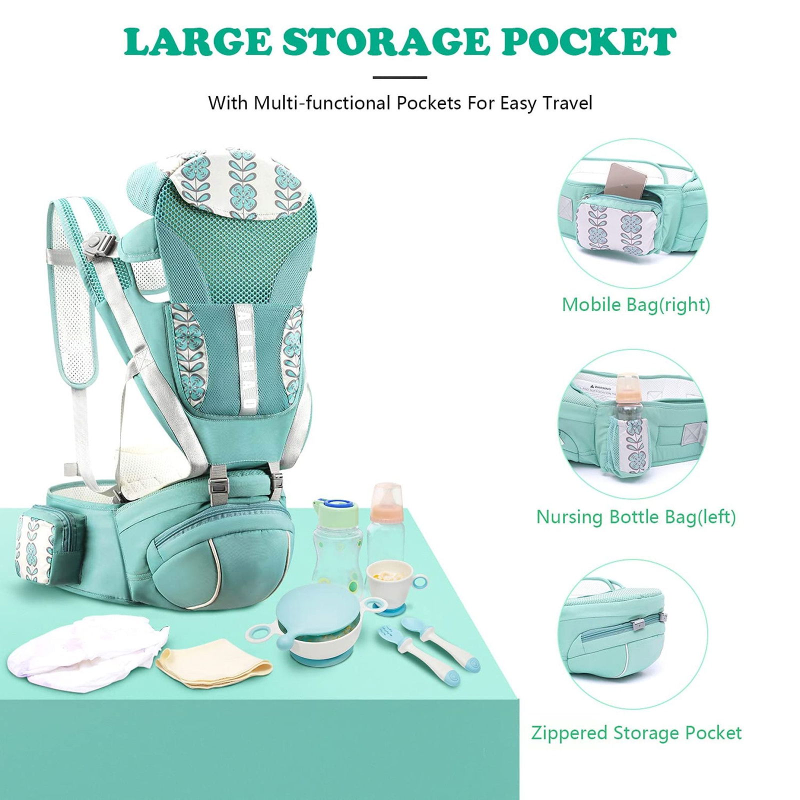 - ✅ Positions de portage multiples : face au parent, face au monde, sur la hanche et dorsale.