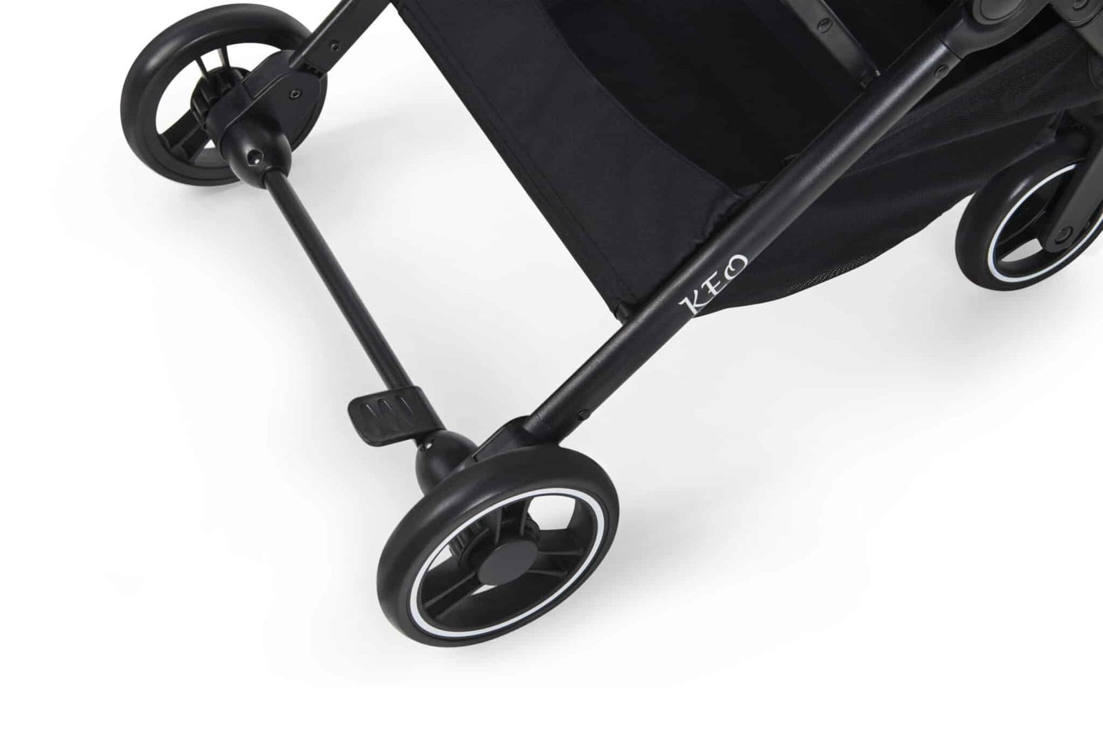 Une caractéristique intéressante de la poussette Keo est sa capuche extensible XXL avec une protection UPF50+ contre les rayons du soleil. Elle offre également une fenêtre permettant une meilleure ventilation et un contact visuel avec votre bébé pendant vos promenades.