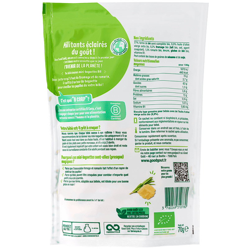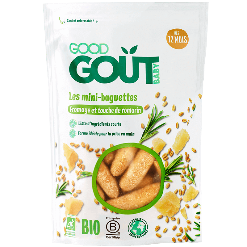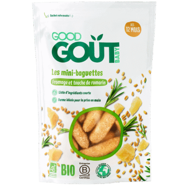 Les Good Goût Mini baguettes au Fromage et romarin 12m+ sont disponibles sur bebemaman.ma, livraison rapide au Maroc. Pour compléter les repas de votre enfant, découvrez aussi notre sélection de biscuits bio ou des laits de croissance comme le BabyBio Primea 3.