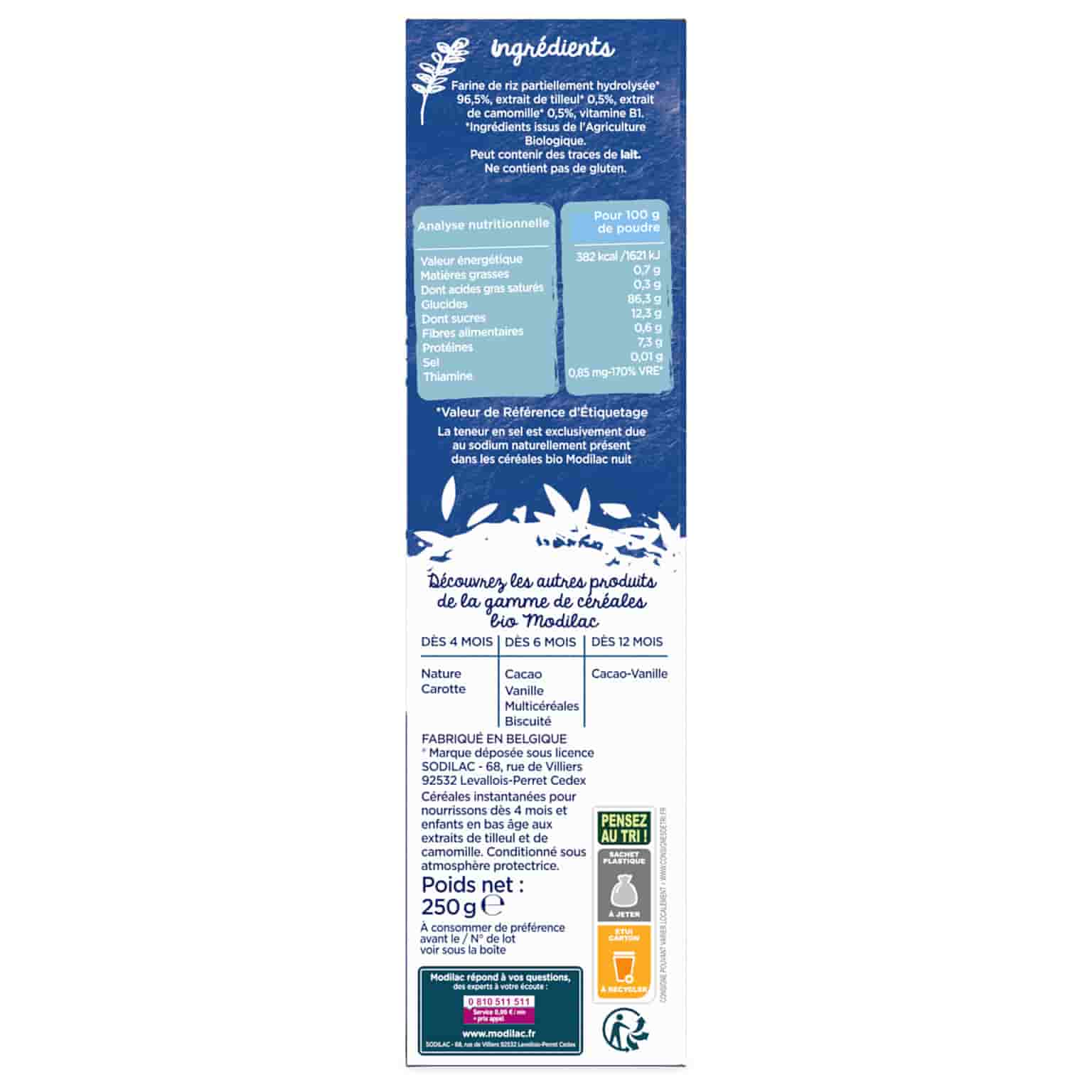 Modilac a sélectionné des ingrédients issus de l’agriculture biologique pour fabriquer ses céréales Nuit calme. On retrouve ainsi de la farine de riz, qui va apporter des fibres, des vitamines et des minéraux essentiels au développement des tout-petits. Ces céréales en poudre contiennent aussi de l’extrait de tilleul, une plante réputée pour ses vertus apaisantes et antispasmodiques, qui ont des effets bénéfiques sur le sommeil ainsi que l’anxiété. L’extrait de camomille apporte ses propriétés tranquillisantes et sédatives, améliorant ainsi l’endormissement et la qualité du sommeil de bébé.