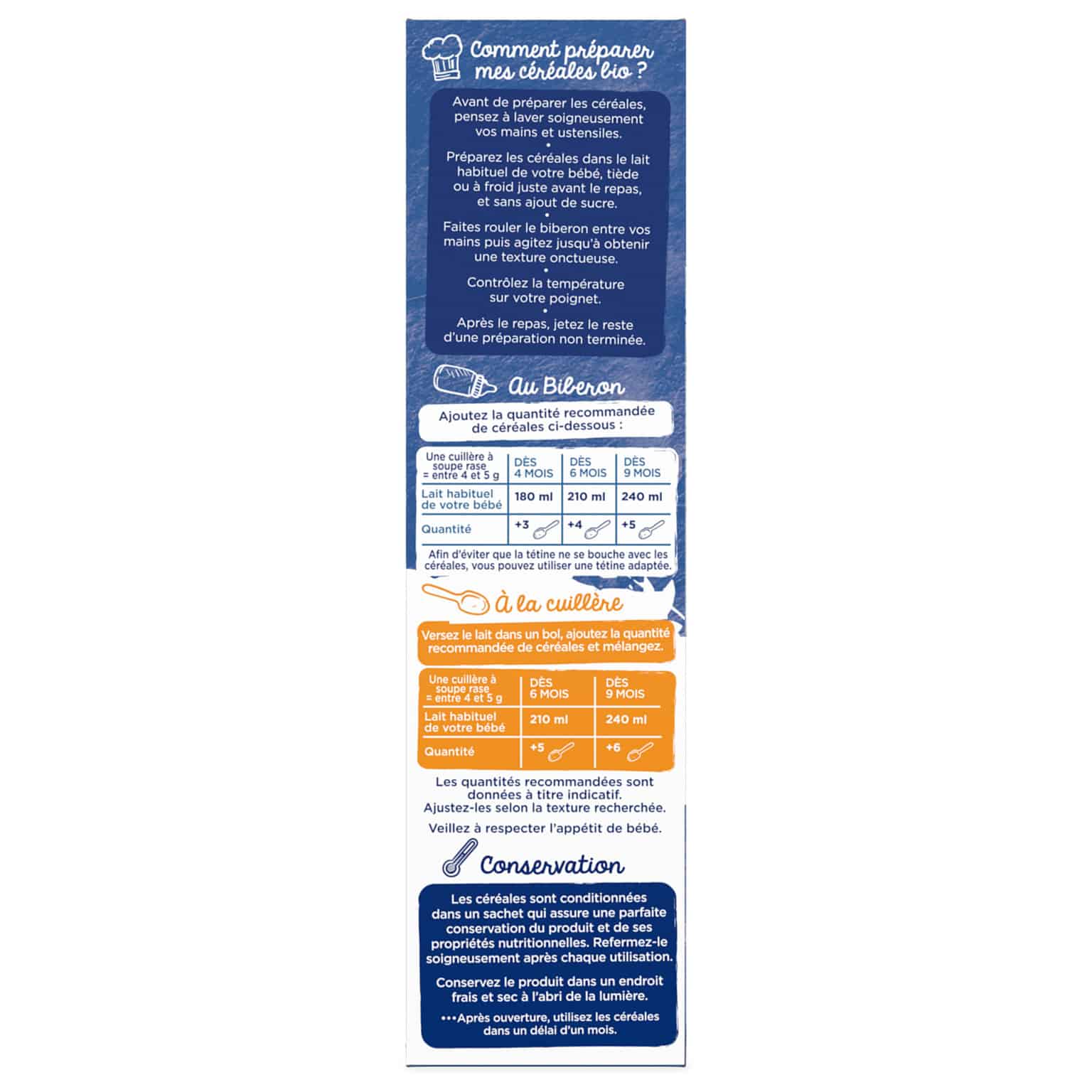 | Une cuillère à soupe rase = entre 4 et 5 g | Dès 4 mois | Dès 6 mois | Dès 9 mois |