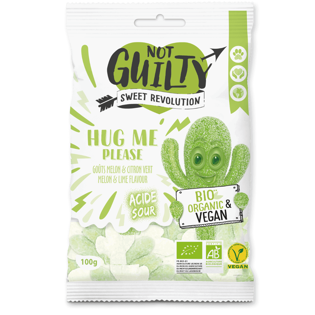 Les bonbons Not Guilty Hug Me sont composés d’ingrédients simples et bons : sirop de blé, jus concentré de fruits (melon, citron vert), pectine naturelle, acide citrique et extraits végétaux. Le tout certifié AB Bio et sans gélatine animale.