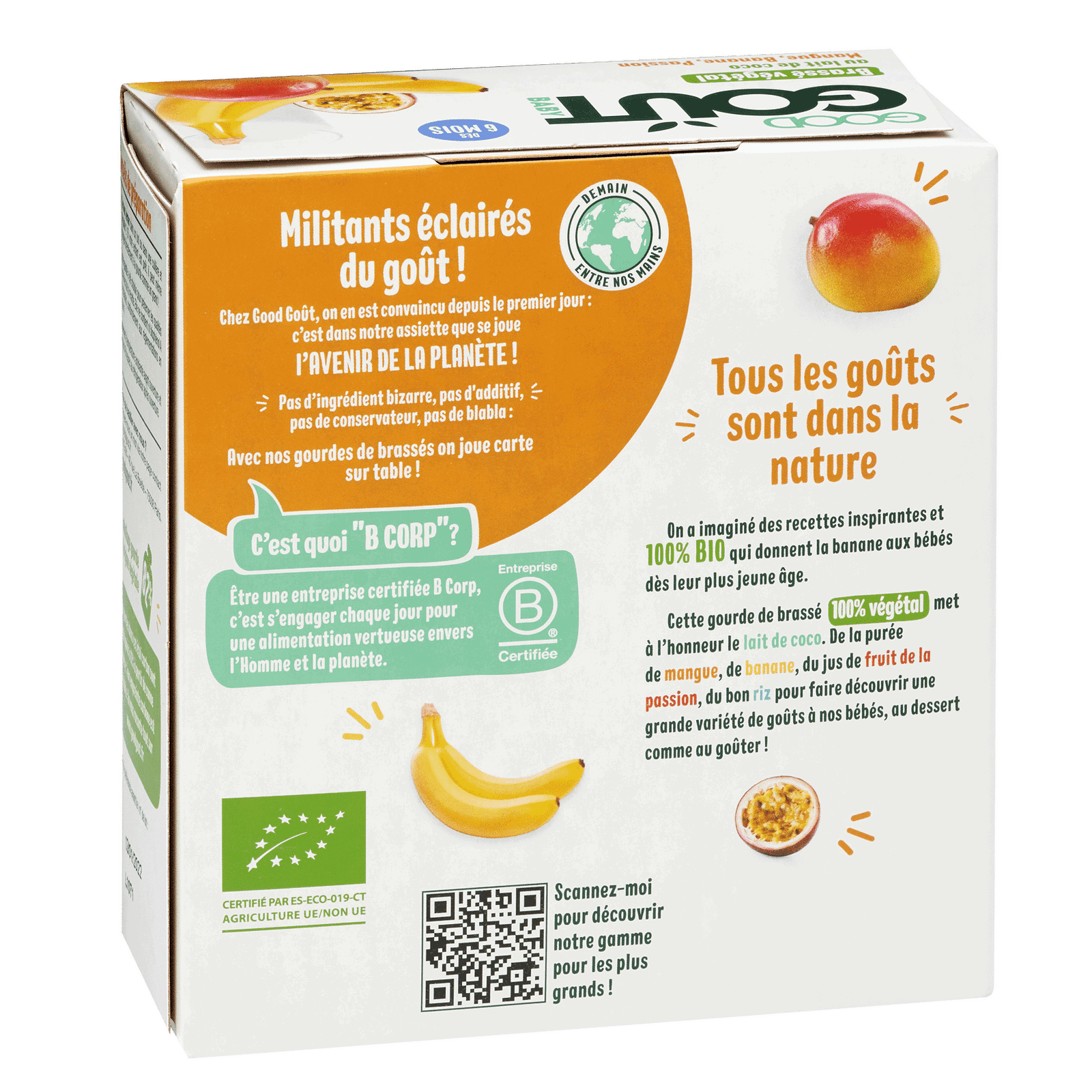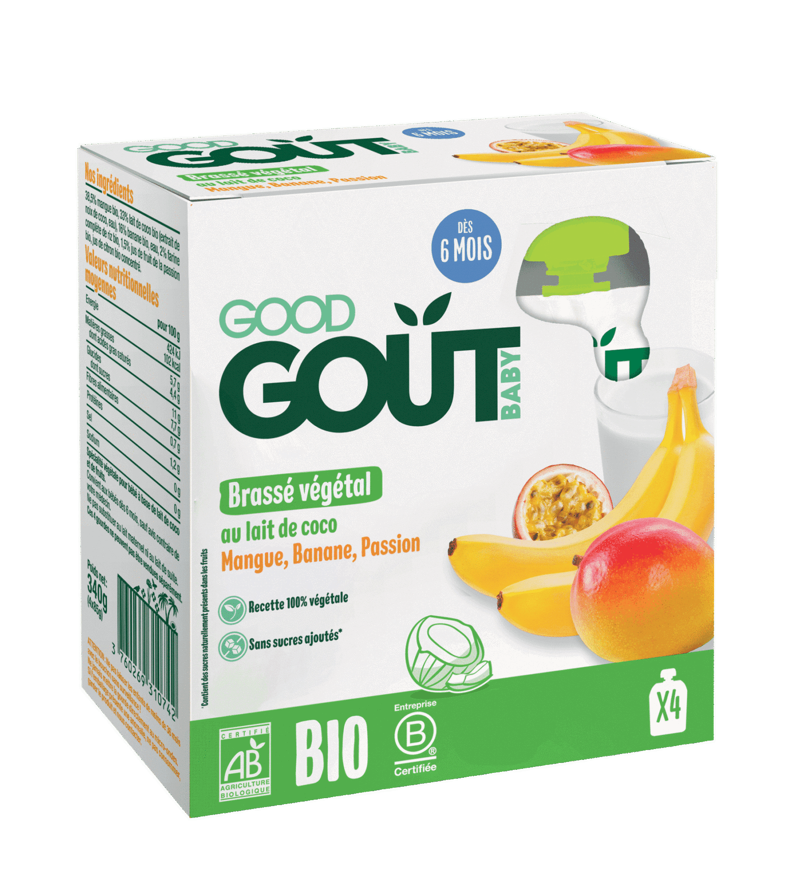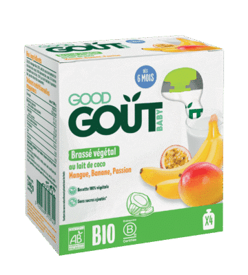 Good Goût 4 Gourdes Brassés Coco Mangue Banane Passion – dès 6 mois Disponible en vente sur le site Bebemaman.ma qui assure une livraison express partout au Maroc et aussi disponible dans le magasin Bebemaman à Bourgogne Casablanca.