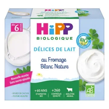 Conçu pour les tout-petits HiPP Délices de Lait Fromage Blanc Nature Bio dès 6 mois 4x100g offre une texture onctueuse et un goût naturel. Élaboré avec du lait biologique, ce dessert garantit un apport essentiel en calcium pour soutenir la croissance de bébé.
