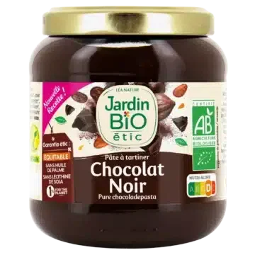 Découvrez la pâte à tartiner Jardin Bio étic Cacao Noir 350g, une gourmandise bio sans huile de palme, riche en noisettes, pour des goûters sains et savoureux.