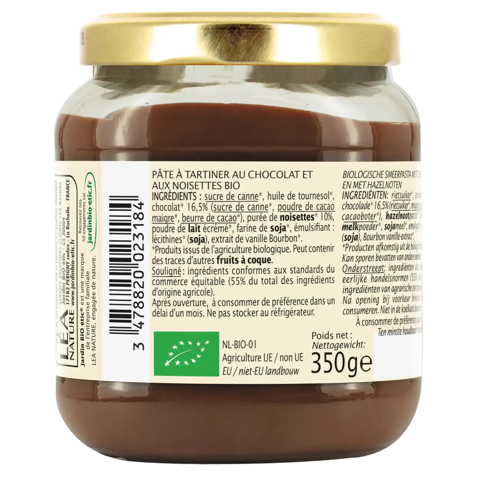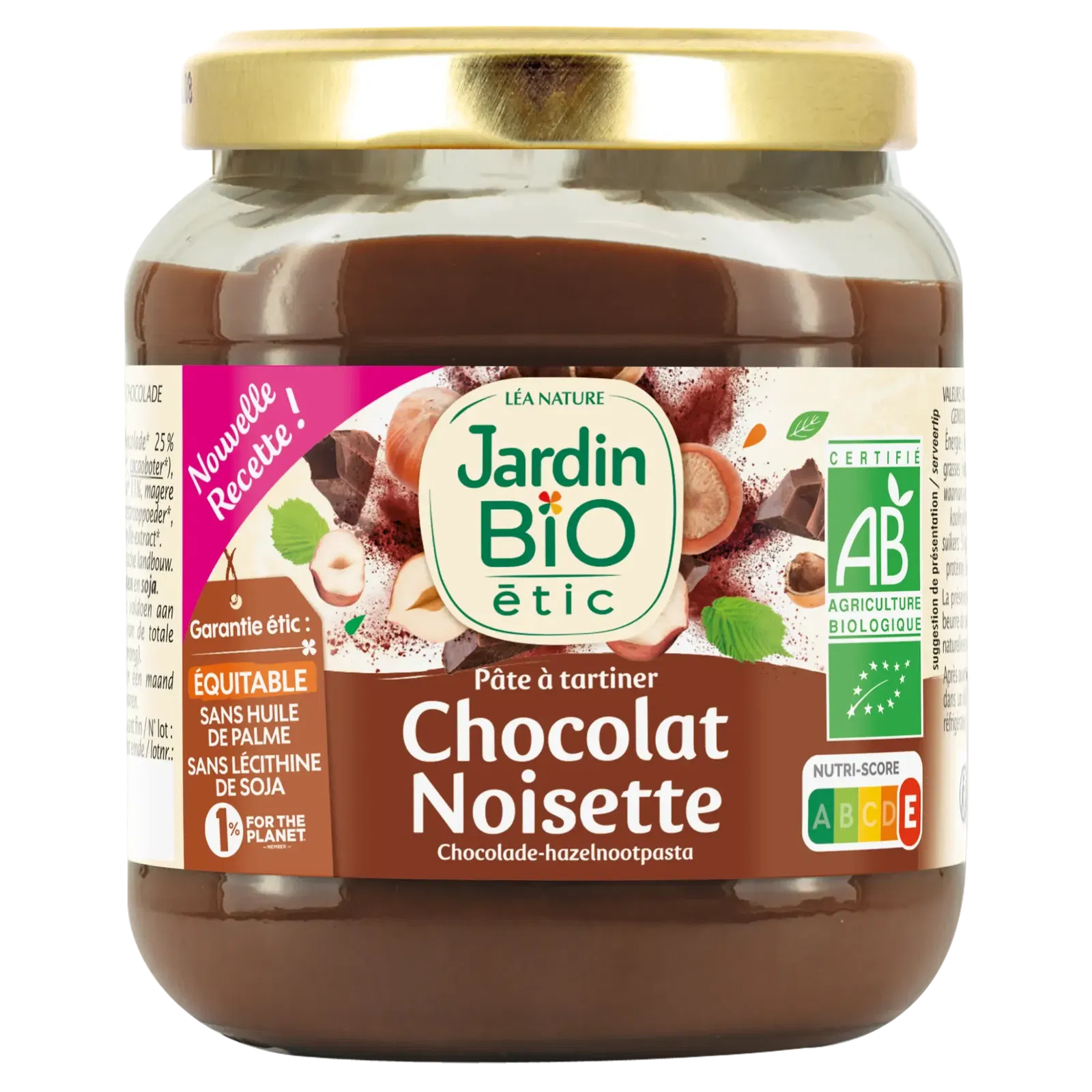 Son délicieux goût de noisette et de chocolat font de la pâte à tartiner Jardin BiO étic, sans huile de palme, le régal des gourmands.
