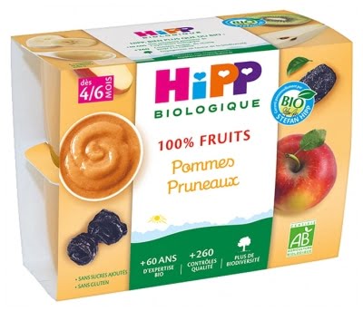 HiPP 100% Fruits Pommes Pruneaux dès 4/6 Mois Bio 4 Pots sont des purées de pommes et pruneaux en coupelles qui offrent à votre bébé ce que la nature a de meilleur avec :