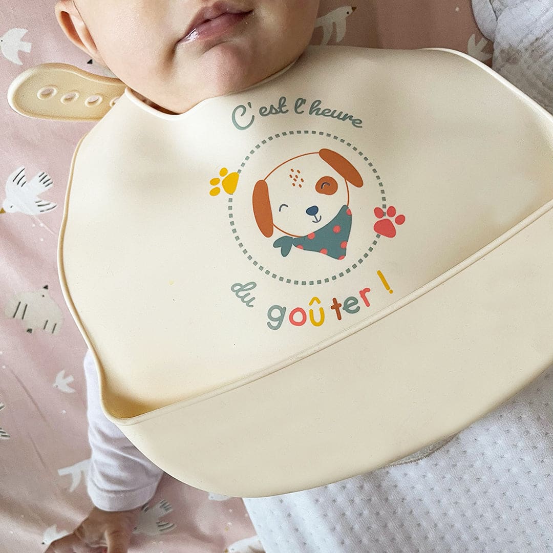Ce bavoir Toutou en silicone, souple au toucher doux, est parfait pour accompagner bébé lors de sa diversification alimentaire ! Avec sa poche récupératrice, la nourriture ne tombe plus au sol.