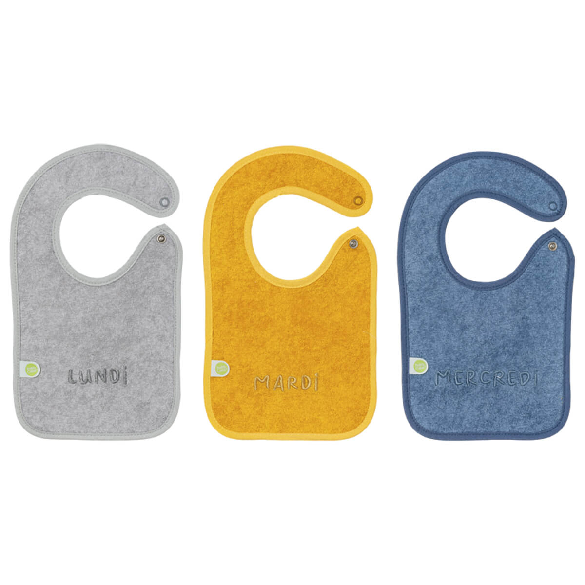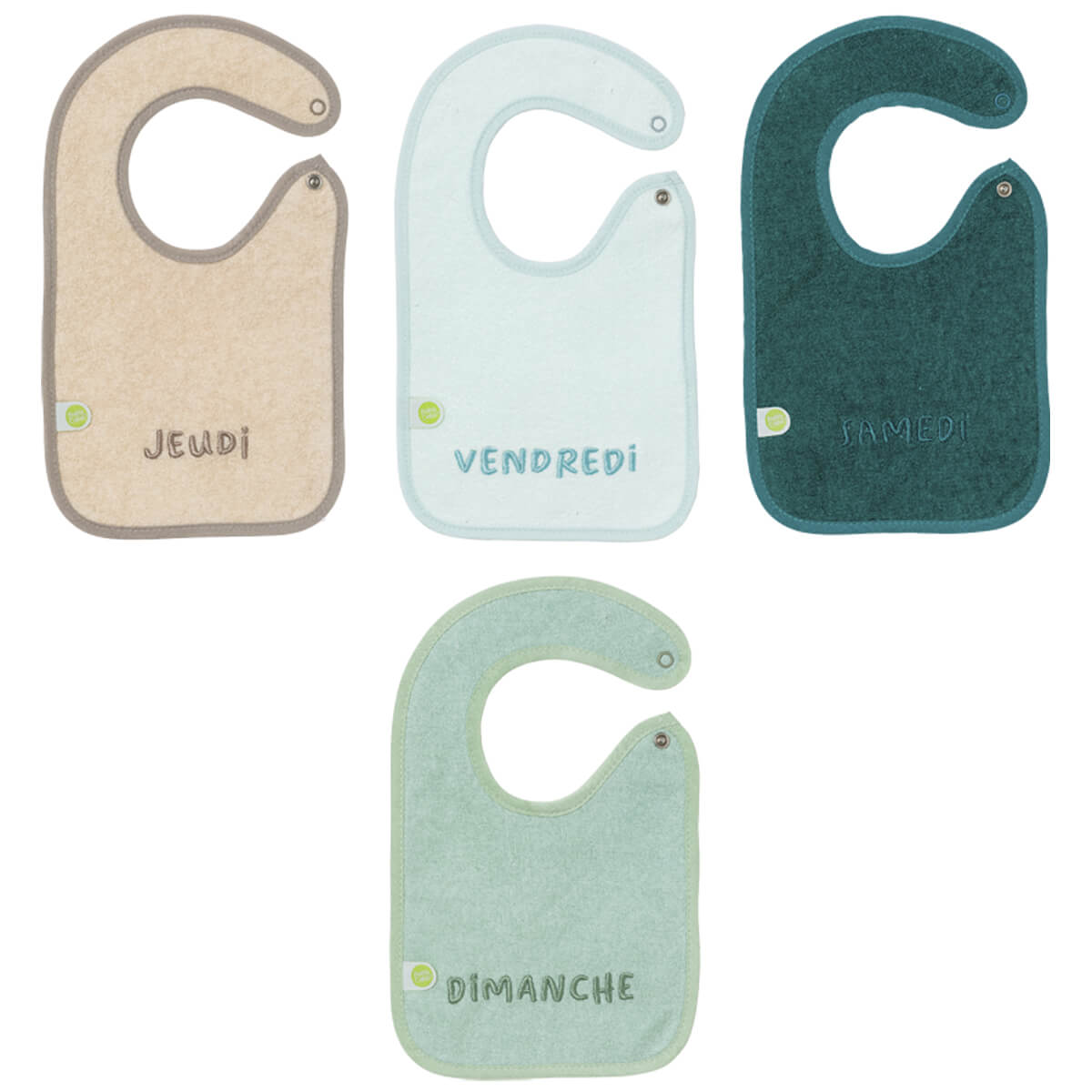 Le jour de la semaine est brodée sur chaque bavoir : un indispensable du trousseau de naissance.