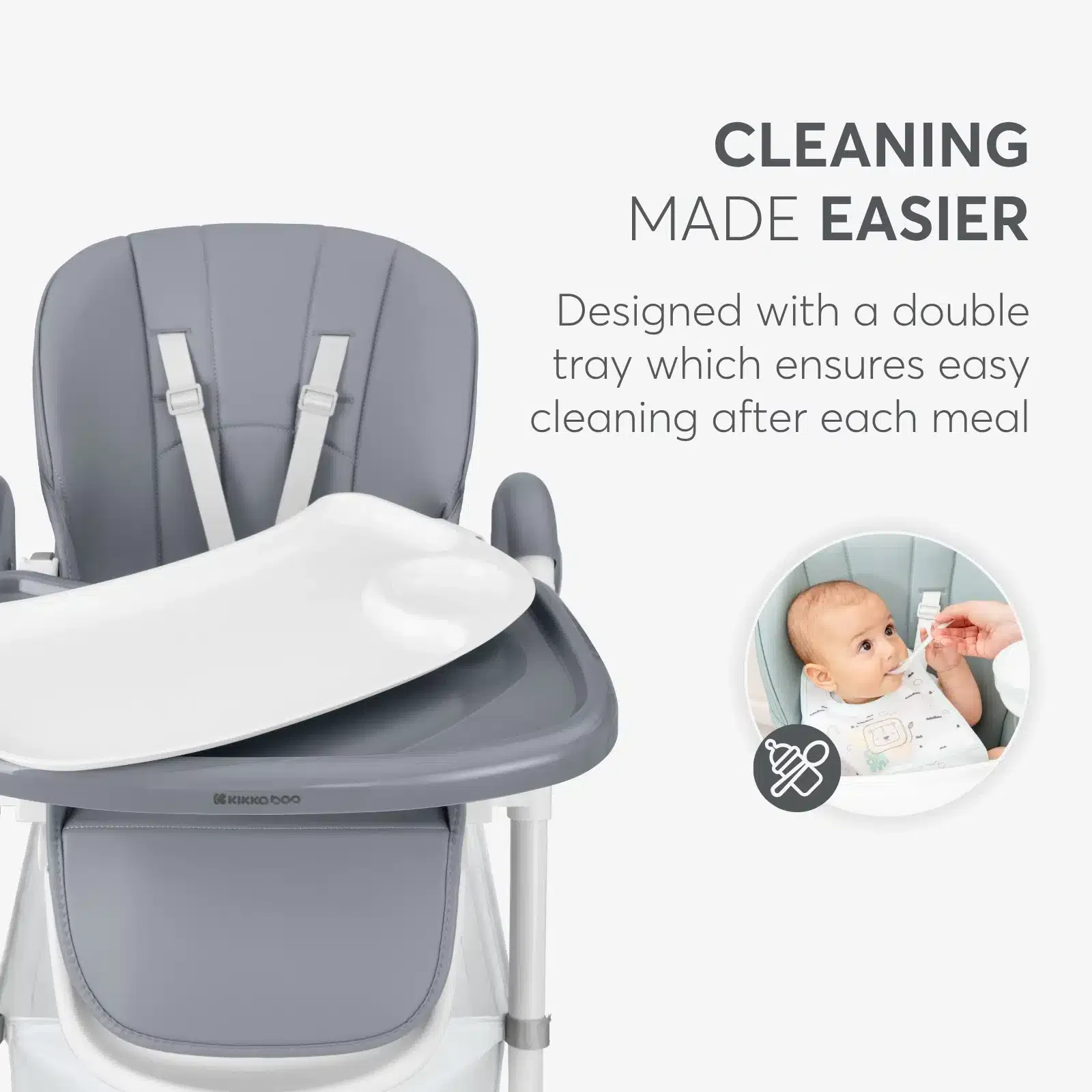 La Kikkaboo Chaise haute Spicy Gris combine sécurité, confort et design moderne. Un choix idéal pour accompagner votre enfant dans ses premiers repas.