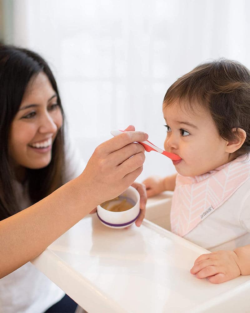 Pour une première utilisation optimale, stérilisez les cuillères à l’aide d’un stérilisateur vapeur ou micro-ondes. Commencez par proposer de très petites quantités d’aliment en effleurant doucement les lèvres de bébé pour l’inciter à ouvrir la bouche.