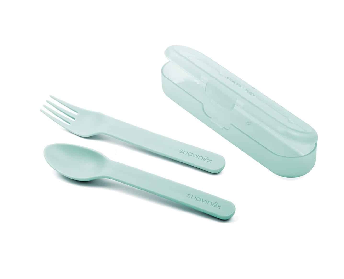 Suavinex Set Couverts avec Étui Vert – 2 couverts ergonomiques pour bébé avec étui pratique et hygiénique, résistants, compatibles lave-vaisselle et micro-ondes.