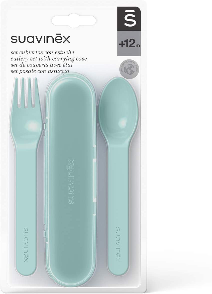Suavinex ensemble de Cuillère et Fourchette avec étui 12m+ Vert